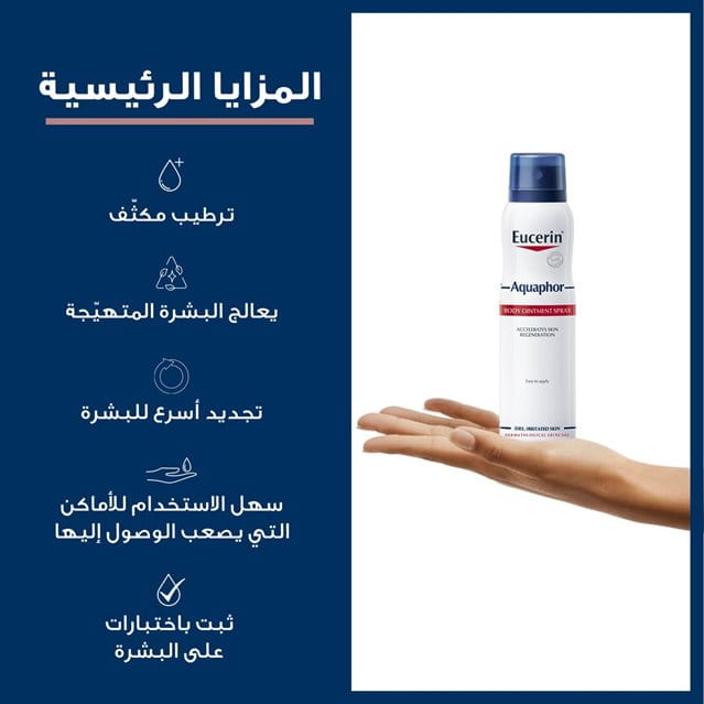لمنح مناطق الجسم الأكبر راحة فورية وسهلة التطبيق، ابتكرنا مرهم بخاخ الجسم Eucerin Aquaphor Body Ointment Spray. يسمح موزّع الرذاذ المبتكر بالوصول بشكل كامل إلى أي مكان من الجسم. توفر الفوهة تطبيقًا مستمرًا ومتساويًا للمرهم ويمكن حتى استخدامه بالمقلوب - مما يسمح بالوصول إلى البشرة الجافة في أي مكان من الجسم بدرجة 360. ثبت سريريًا أن المرهم الخالي من الماء يعمل على ترميم البشرة الجافة والمتحسسة من خلال إنشاء حاجز واقٍ مثالي لتجديدها ومنحها تهدئة وراحة فورية.